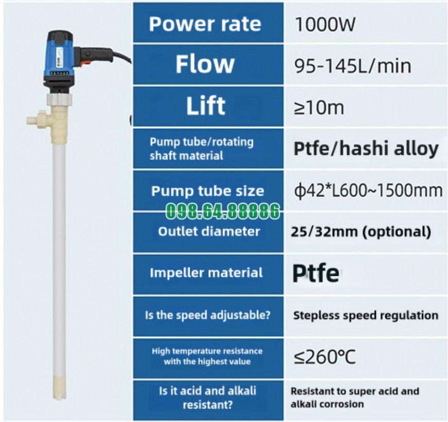 Bơm điện nhúng hóa chất PTFE cho thùng phuy công nghiệp JDT-1000W