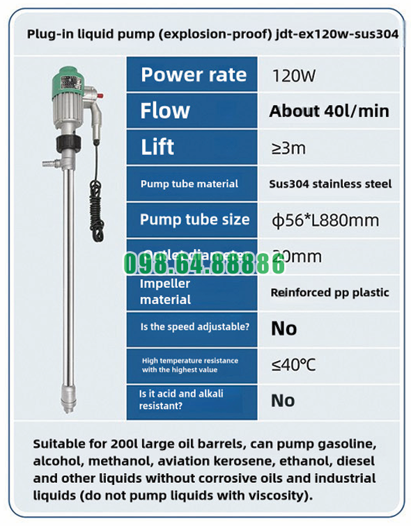 Bơm chất lỏng cắm điện chống cháy nổ JDT-EX120W-SUS304 chuyên dùng bơm xăng và cồn