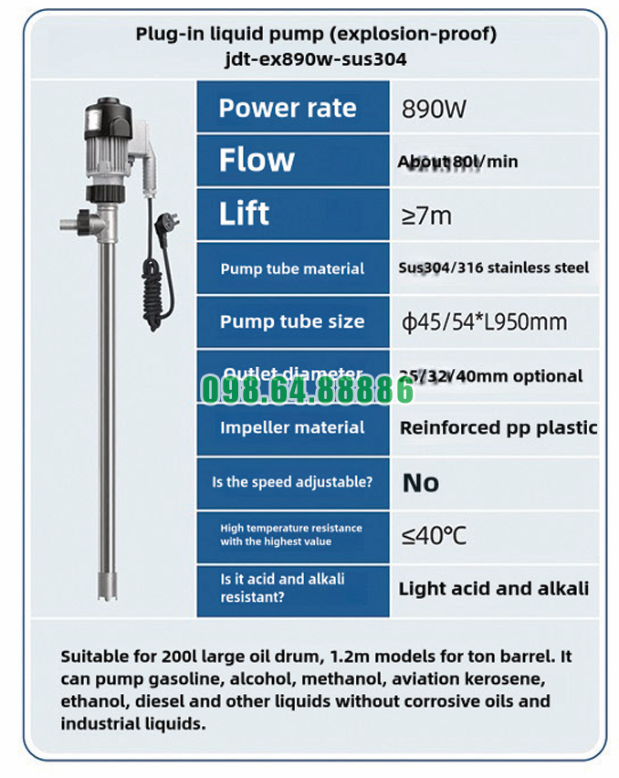 Máy bơm chất lỏng cắm trực tiếp chống cháy nổ JDT-EX890W-SUS304 có thể sử dụng cho dầu, dung môi, cồn và hóa chất nhẹ.