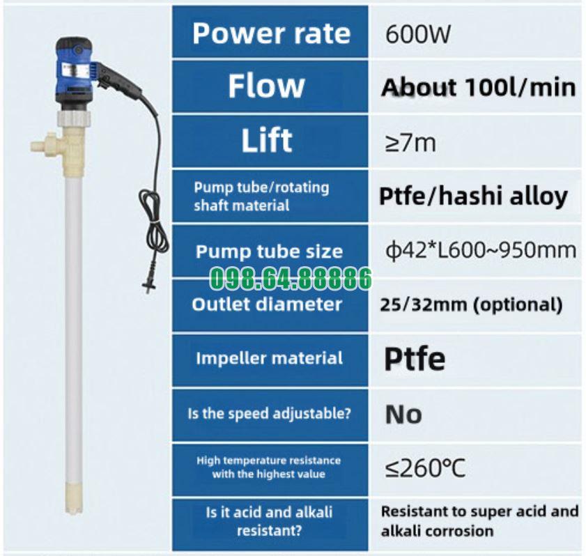 Bơm thùng phuy hóa chất hiệu suất cao, lưu lượng khoảng 100 lít/phút model JDT-600W