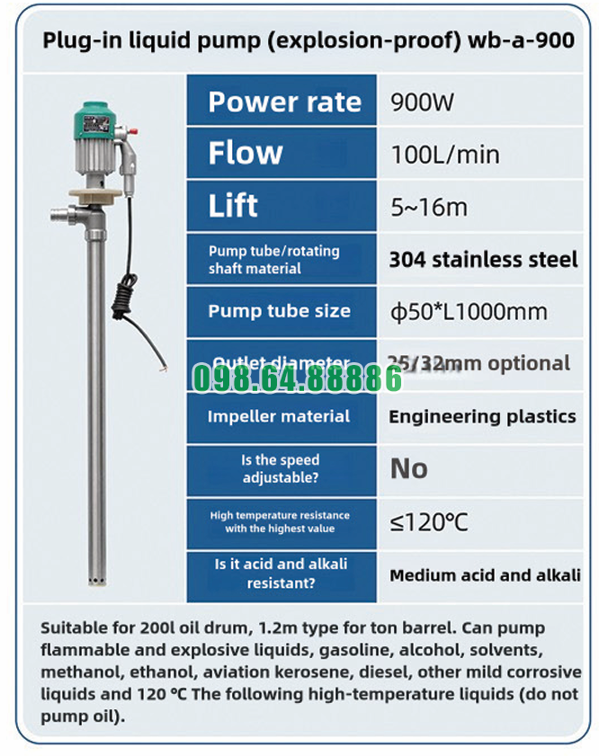 Thiết kế ống bơm inox 304 chống gỉ sét của Máy bơm chất lỏng inox 304 chống cháy nổ WB-A-900